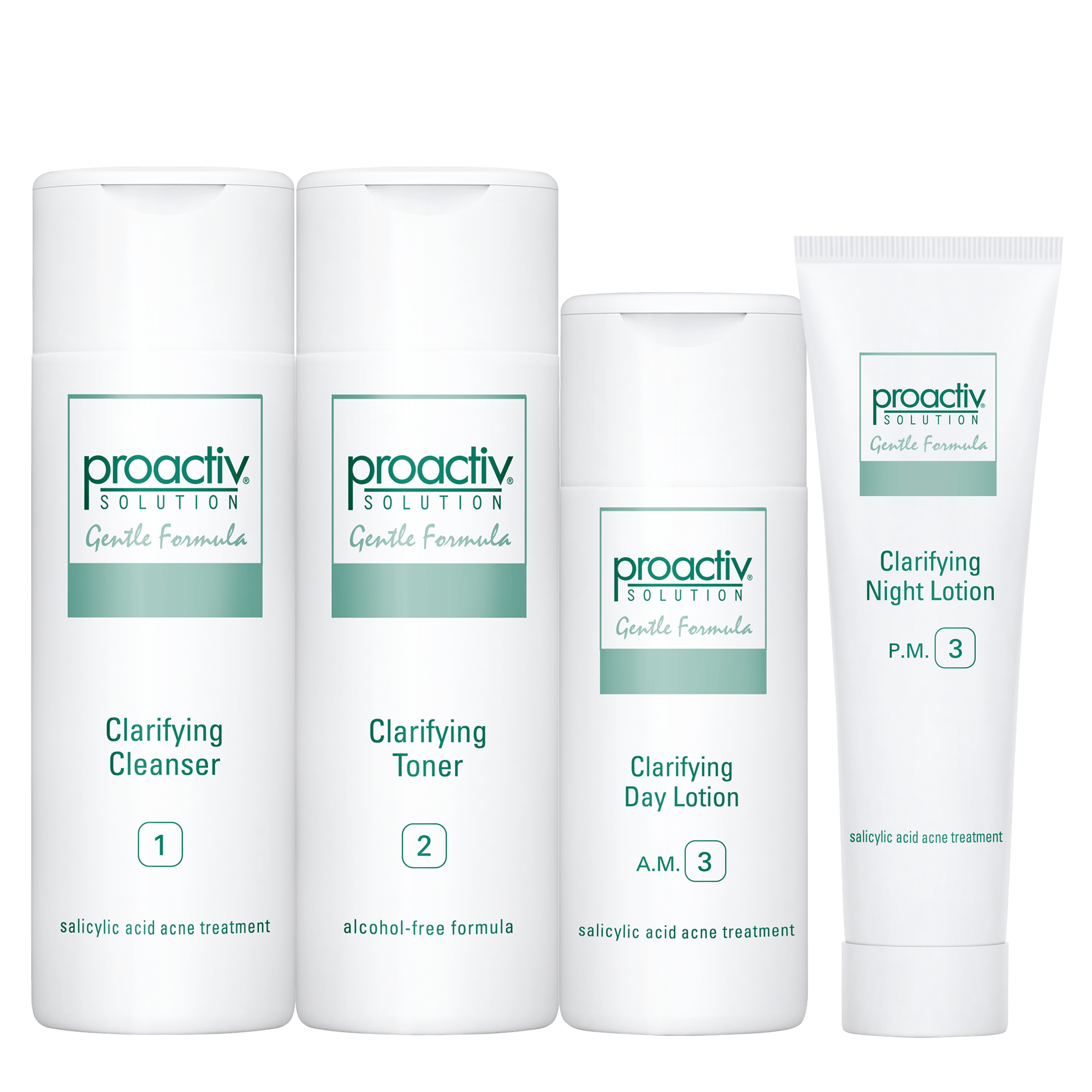 - <p>Proactiv Gentle Formula Clarifying Cleanser:</p> <li>Helps eliminate oil and skin-dulling impurities</li> <li>Sloughs off dead skin cells for a brighter-looking complexion</li> <li>Tiny exfoliating beads help unclog pores</li> <p><p>Proactiv Gentle Formula Clarifying Toner:</p><p> <li>Alcohol-free, non-drying formula that revitalizes, refreshes, and soothes the skin</li> <li>Removes all traces of dirt and oil for a radiant complexion</li> <li>Lifts away skin-dulling impurities</li> <p><p>Proactiv Gentle Formula Clarifying Day Lotion:</p><p> <li>Gentle Salicylic Acid-based treatment lotion helps keep skin smooth and under control</li> <li>Penetrates pores to help dry up blemishes and help prevent the formation of blackheads and whiteheads</li> <li>Lightweight moisturizer refines skin's tone and texture with soothing botanical extracts, including Tea Tree, Rosemary, and Chamomile</li> <p><p>Proactiv Gentle Formula Clarifying Night Lotion:</p><p> <li>Features salicylic acid acne medicine at maximum-strength (1%) designed to more gently clear acne blemishes and help prevent new ones from forming</li> <li>Added retinol is designed to deliver skincare benefits overnight</li> <li>Does not include BPO for those wanting a more gentle solution to clearing up their acne</li> <p><p>Contains: Gentle Formula Clarifying Cleanser 4 oz., Gentle Formula Clarifying Toner 4 oz., Gentle Formula Clarifying Day Lotion 2 oz., Gentle Formula Clarifying Night Lotion 1 oz.</p><p>