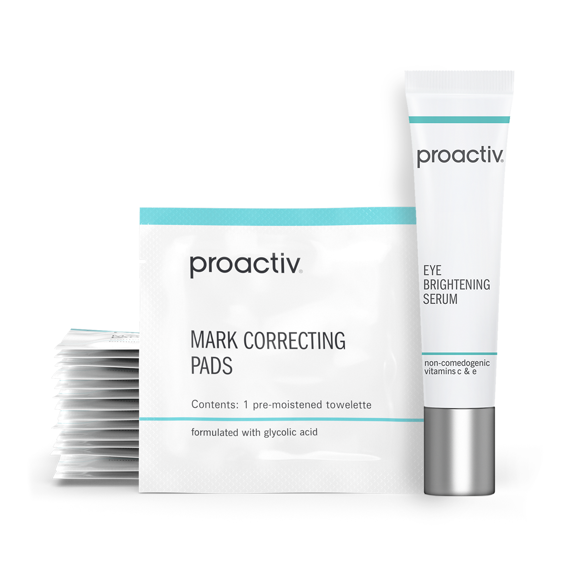 - <p>Proactiv Mark Correcting Pads:</p> <ul> <li>Helps remove oil and other impurities</li> <li>Designed to help reduce the appearance of dark marks left behind by acne blemishes</li> <li>Infused with antioxidants green tea to help soothe and protect the skin</li> <li>Use regularly to help control oil and minimize the appearance of pores</li> <li>Formulated with glycolic acid</li> <li>Non-comedogenic, for acne-prone skin</li> <li>Dermatologist-tested</li> <li>Suitable for all skin types</li> </ul> <p>Proactiv Eye Brightening Serum:</p> <ul> <li>Designed to help fight the look of dark circles and puffiness under the eyes</li> <li>Helps to moisturize, tighten and brighten the delicate area around the eyes</li> <li>Designed to help soothe the under eye area</li> <li>Light silky-rich serum</li> <li>Non-comedogenic</li> <li>Dermatologist-tested</li> </ul> <p>Contains: Mark Correcting Pads (15), Eye Brightening Serum 0.5 oz.</p> <p> </p>